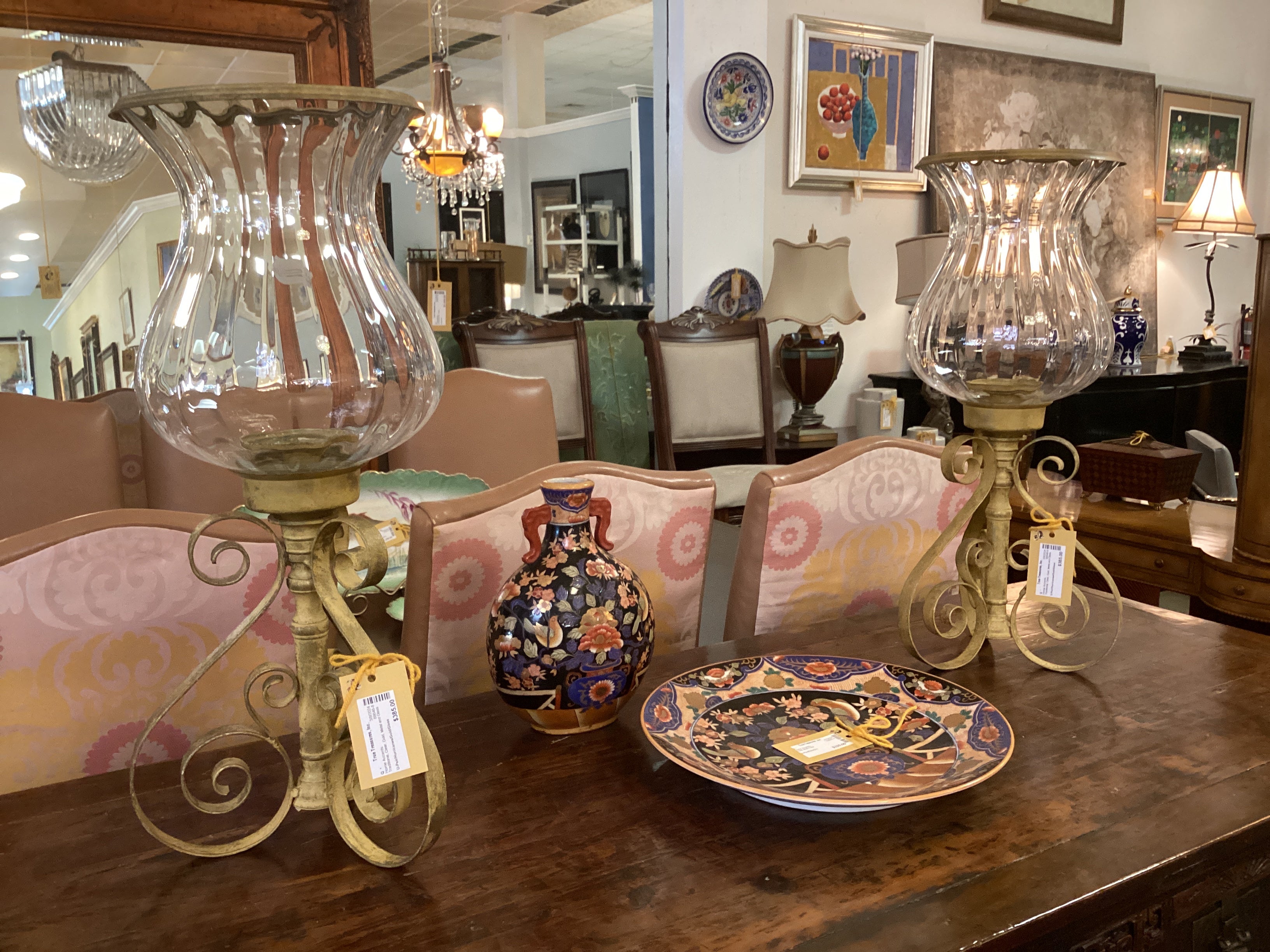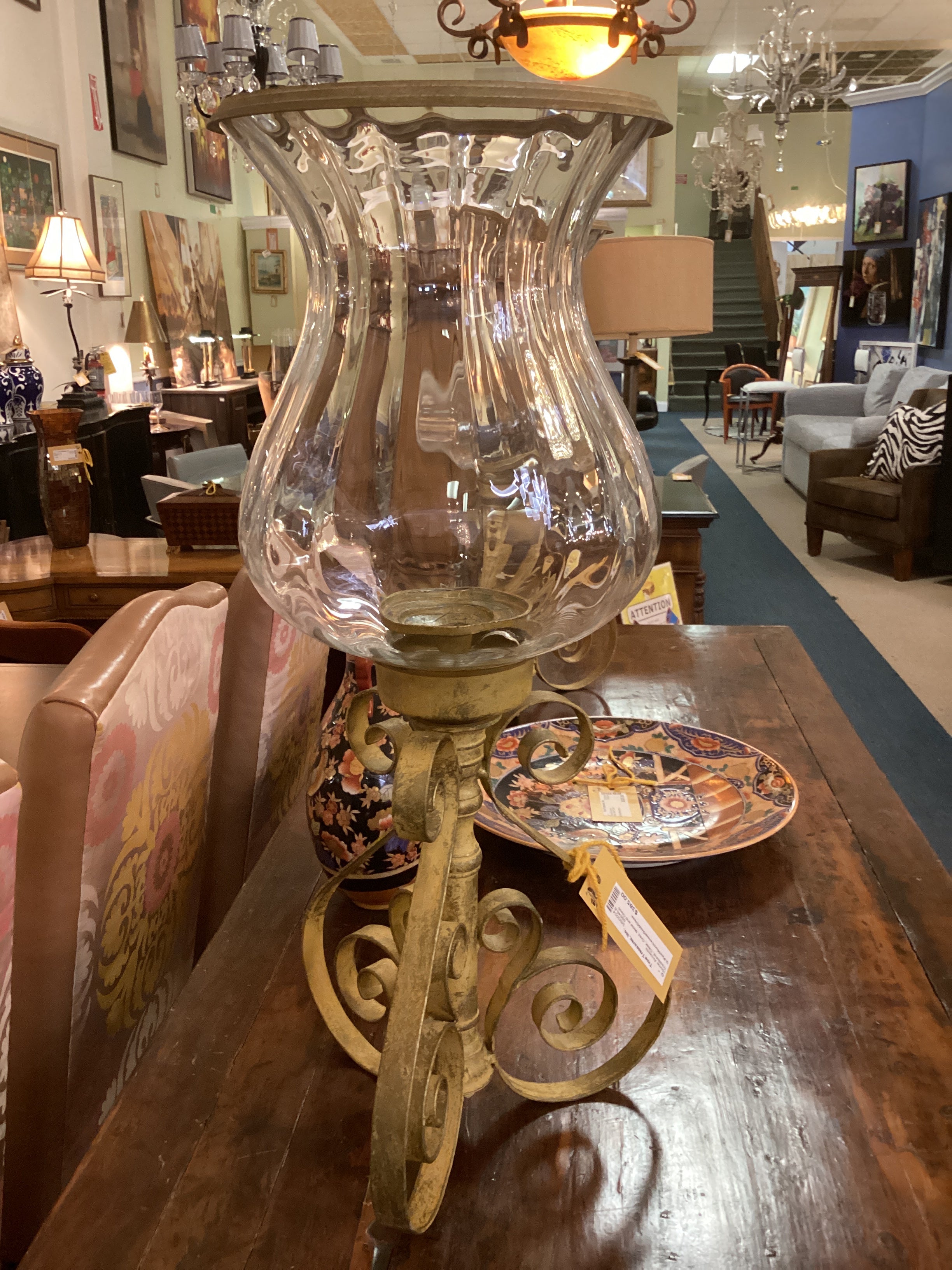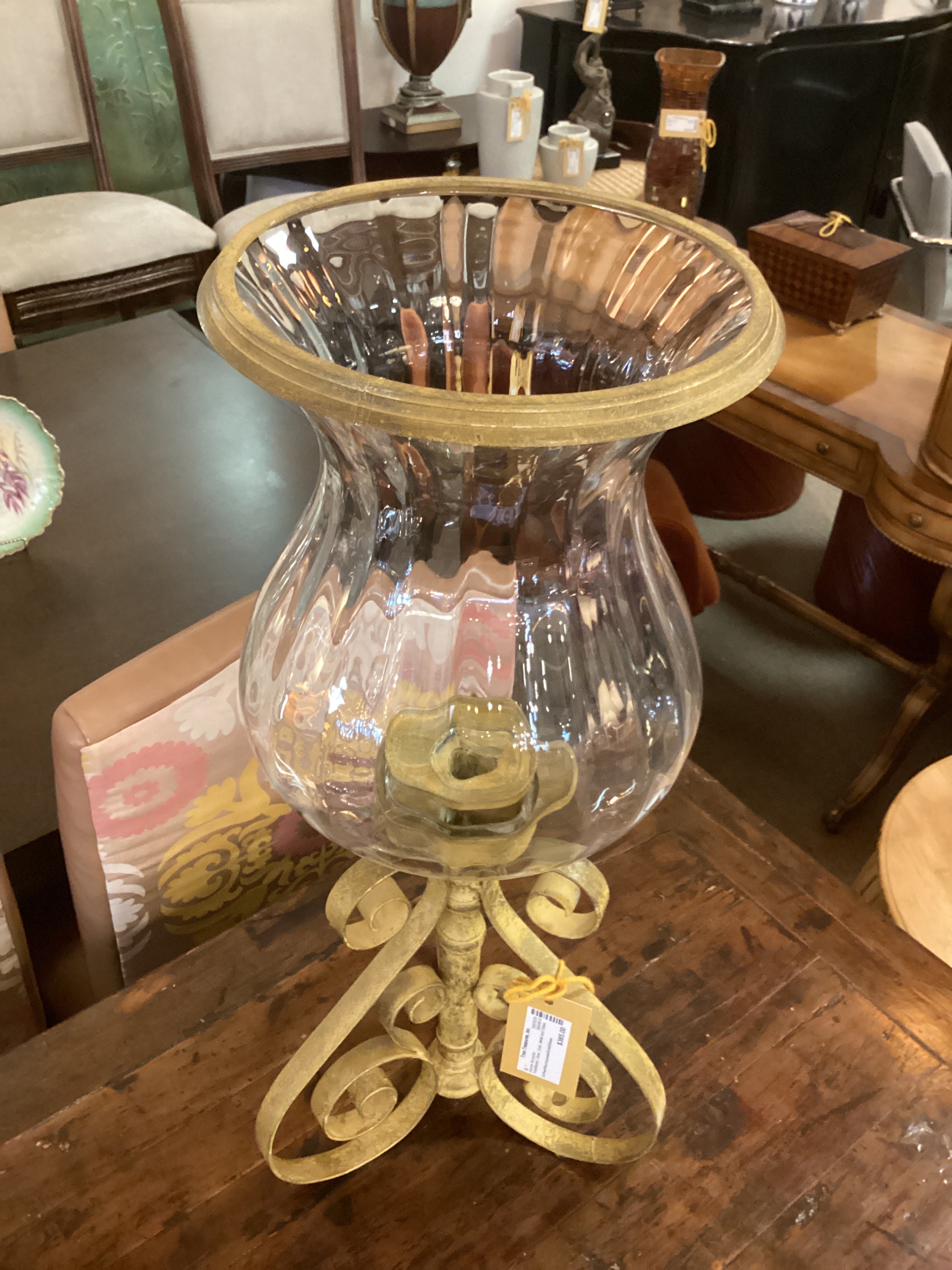 Pair of Gold Metal Scrolled Base Glass Hurricanes