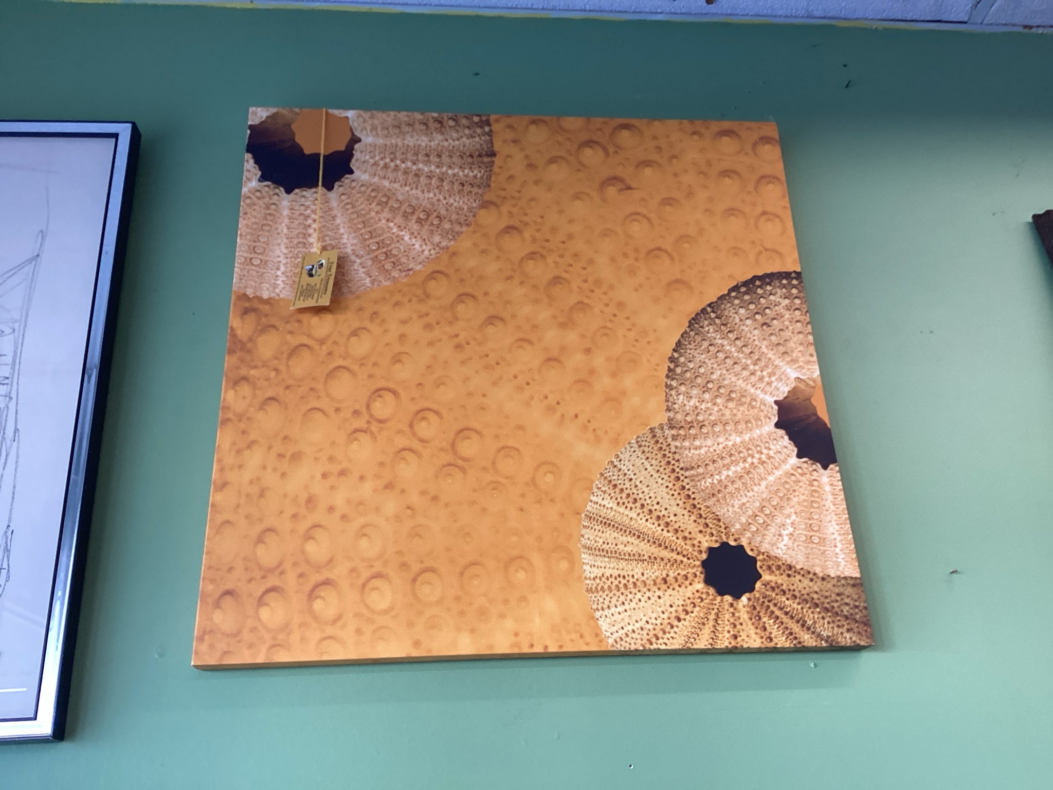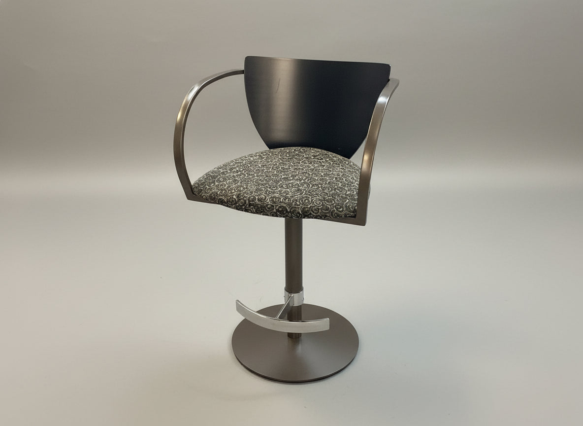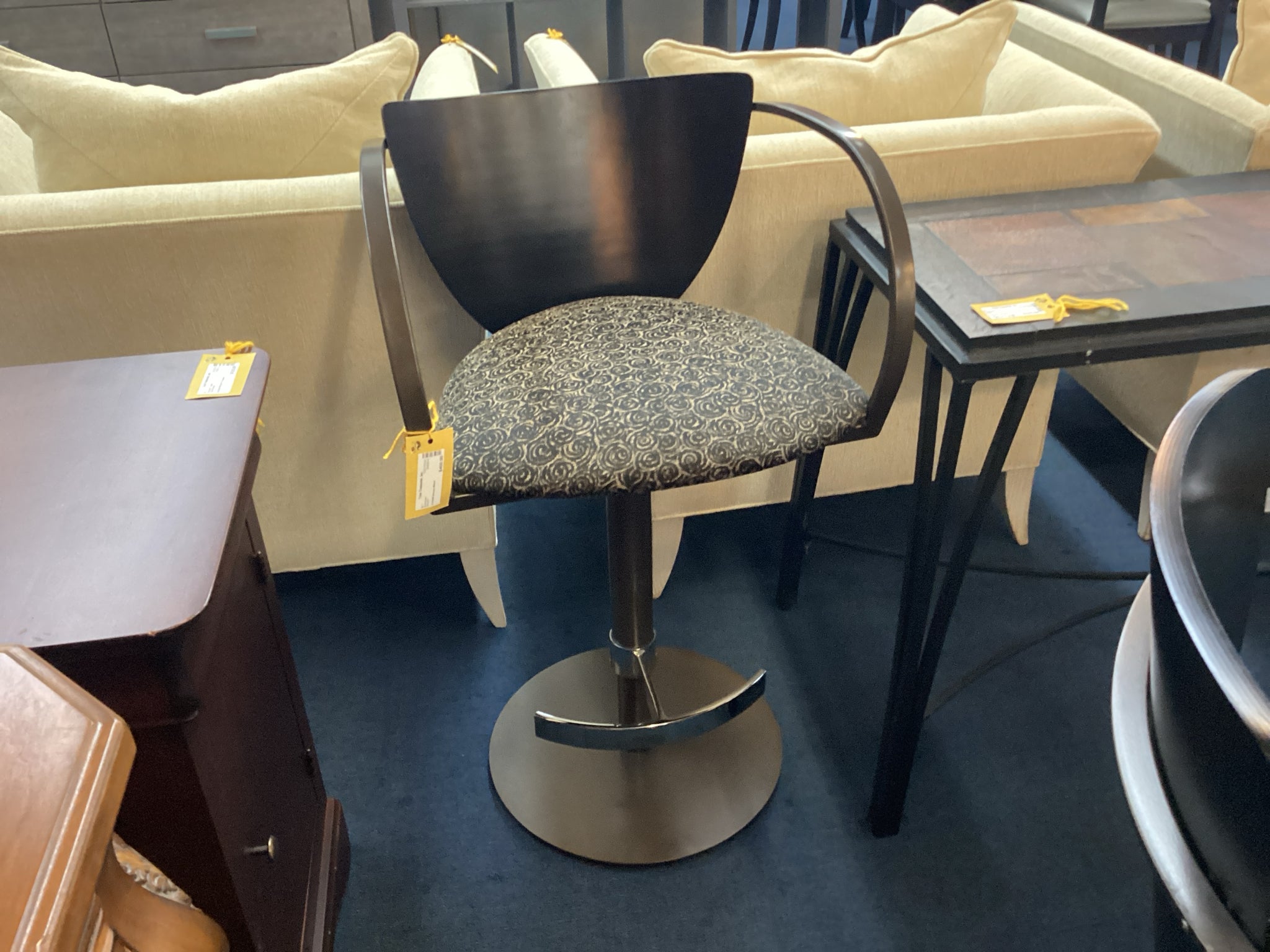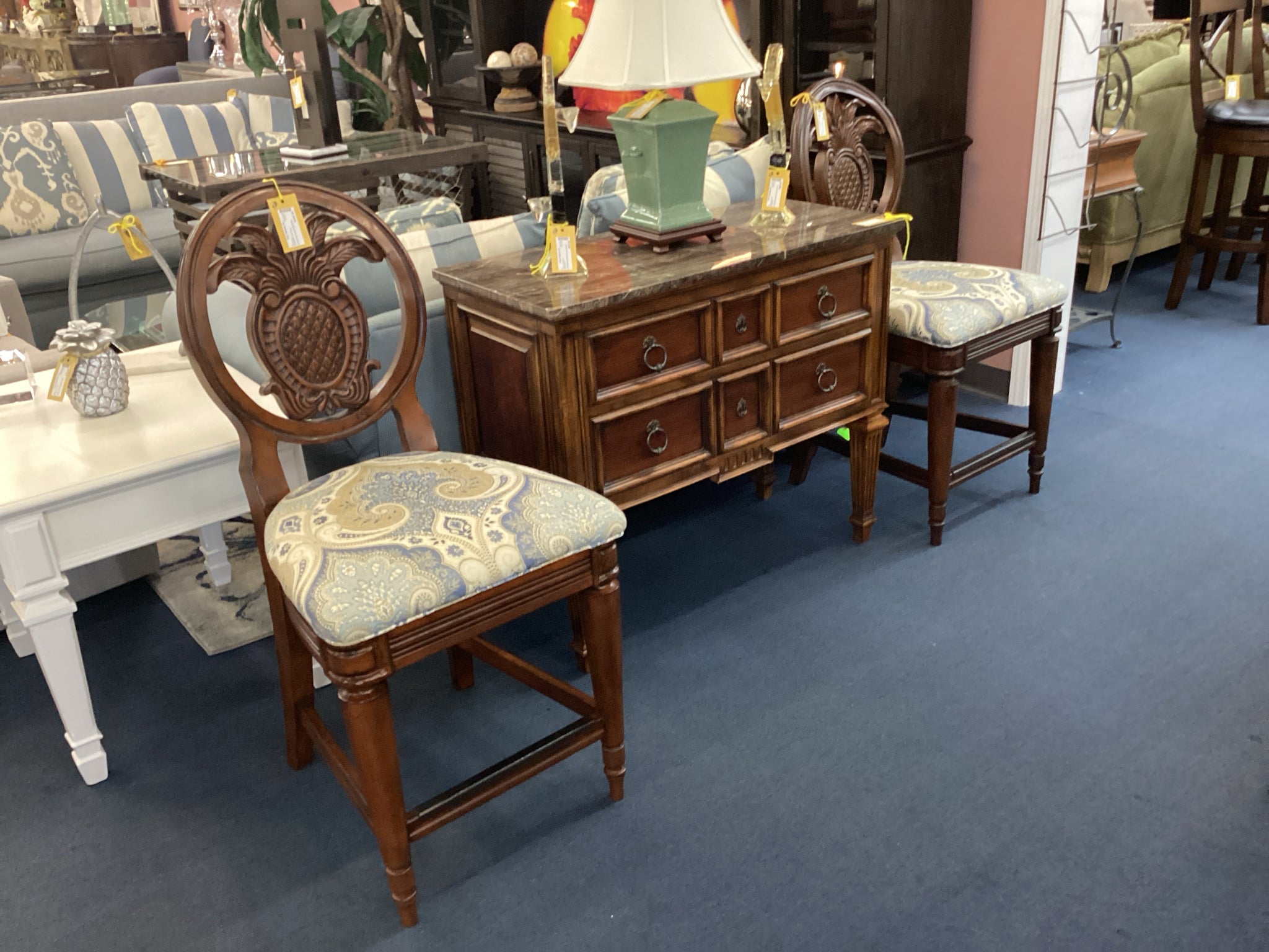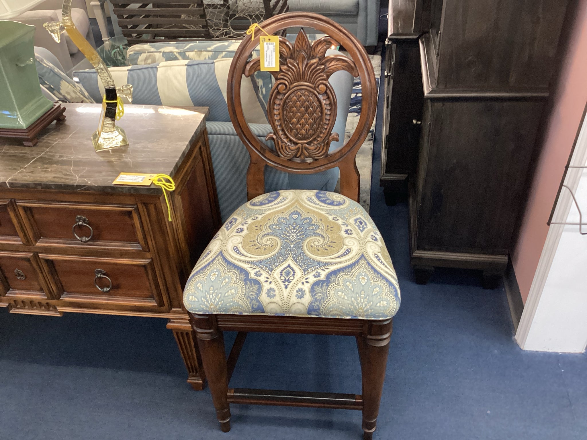 Pair Of Dark Wood Barstools With Blue And White Cushions