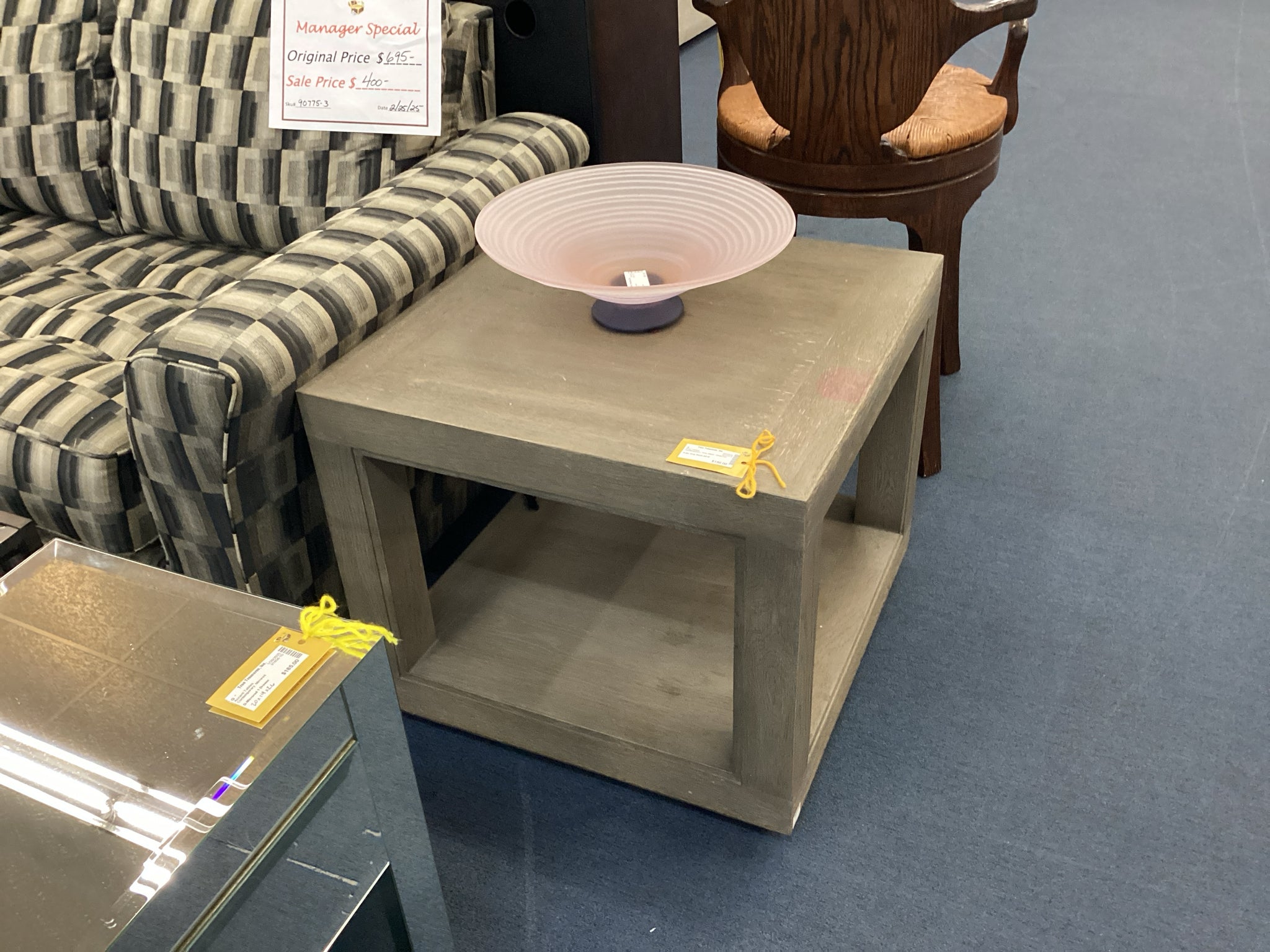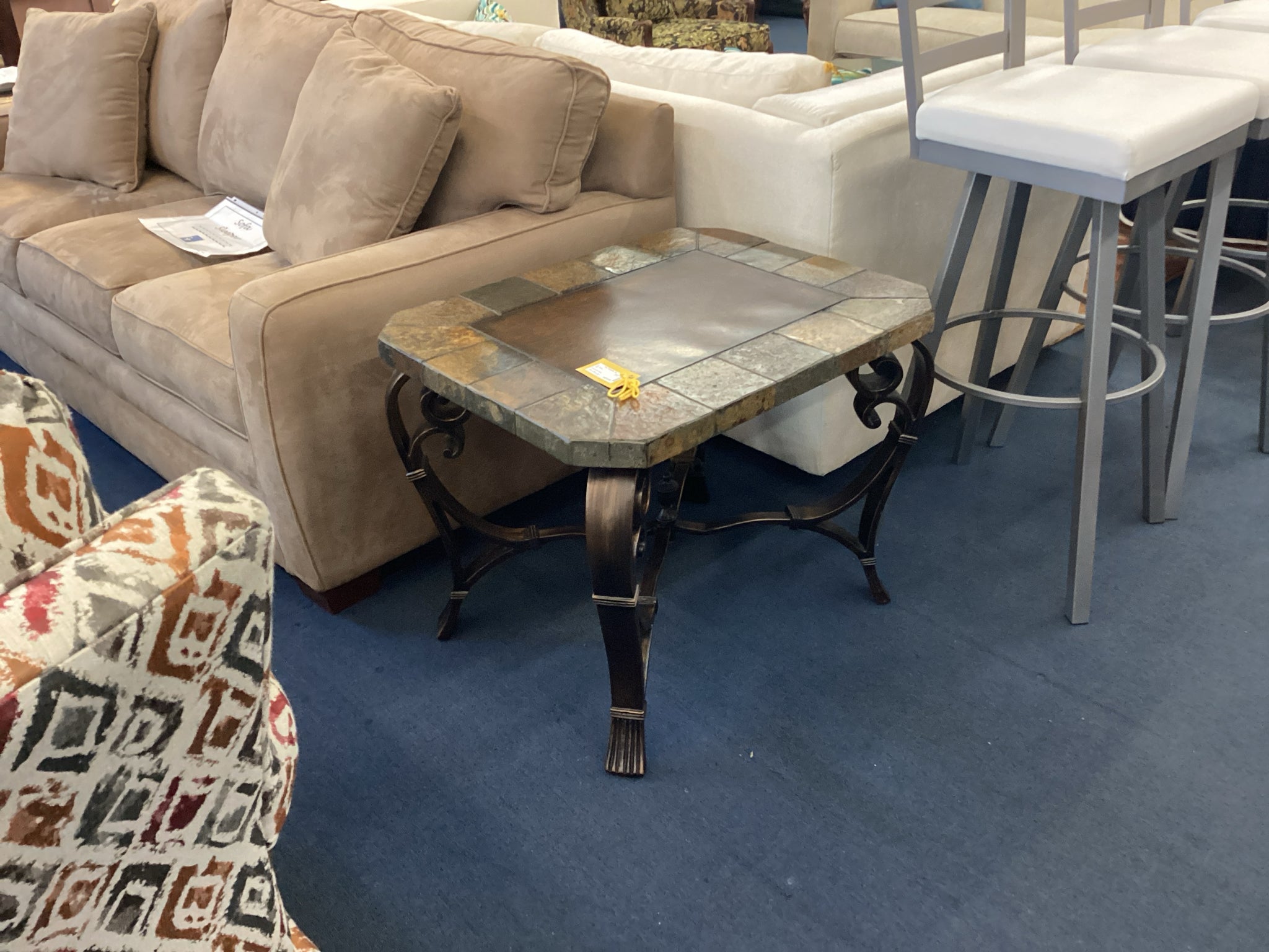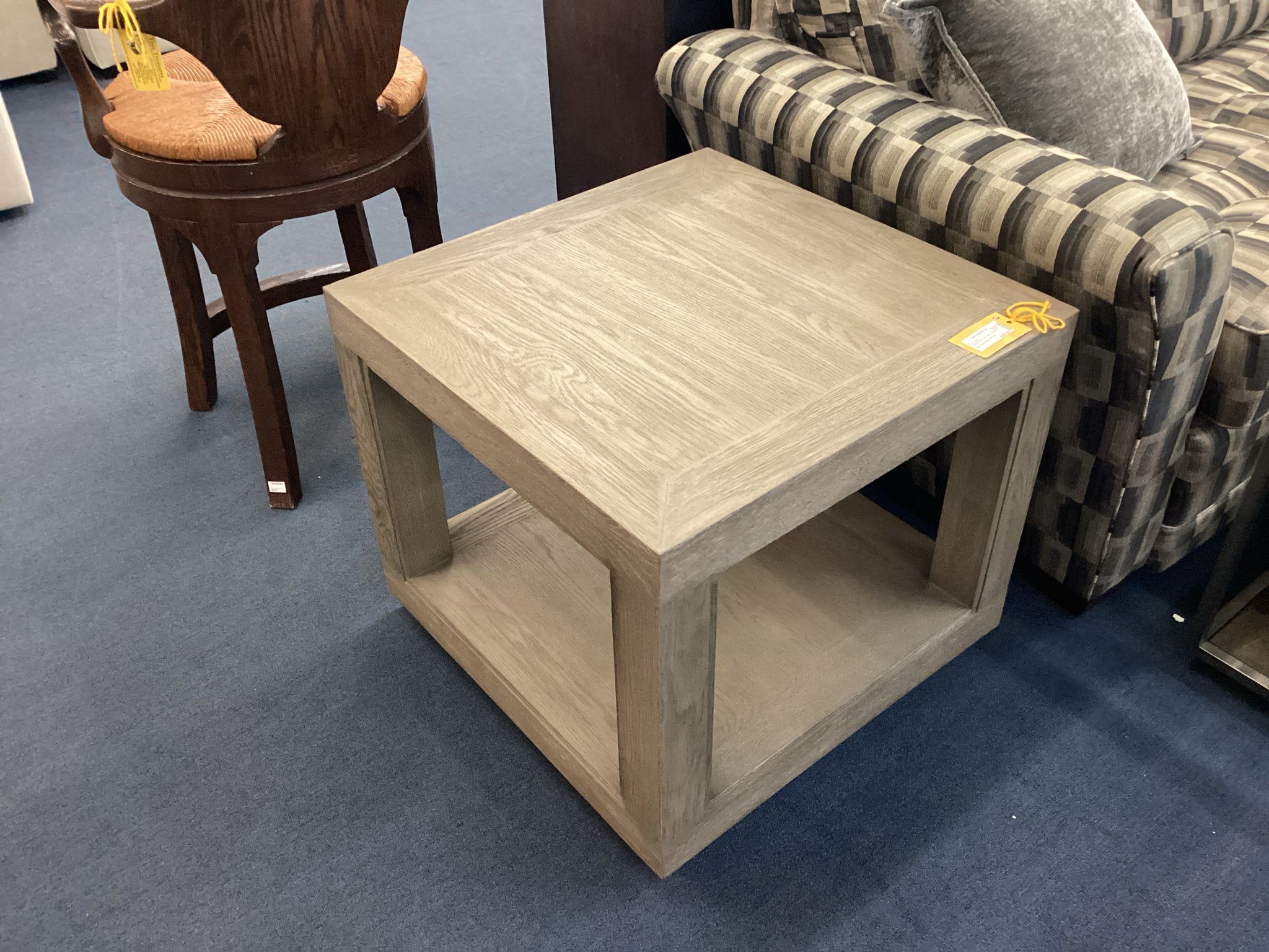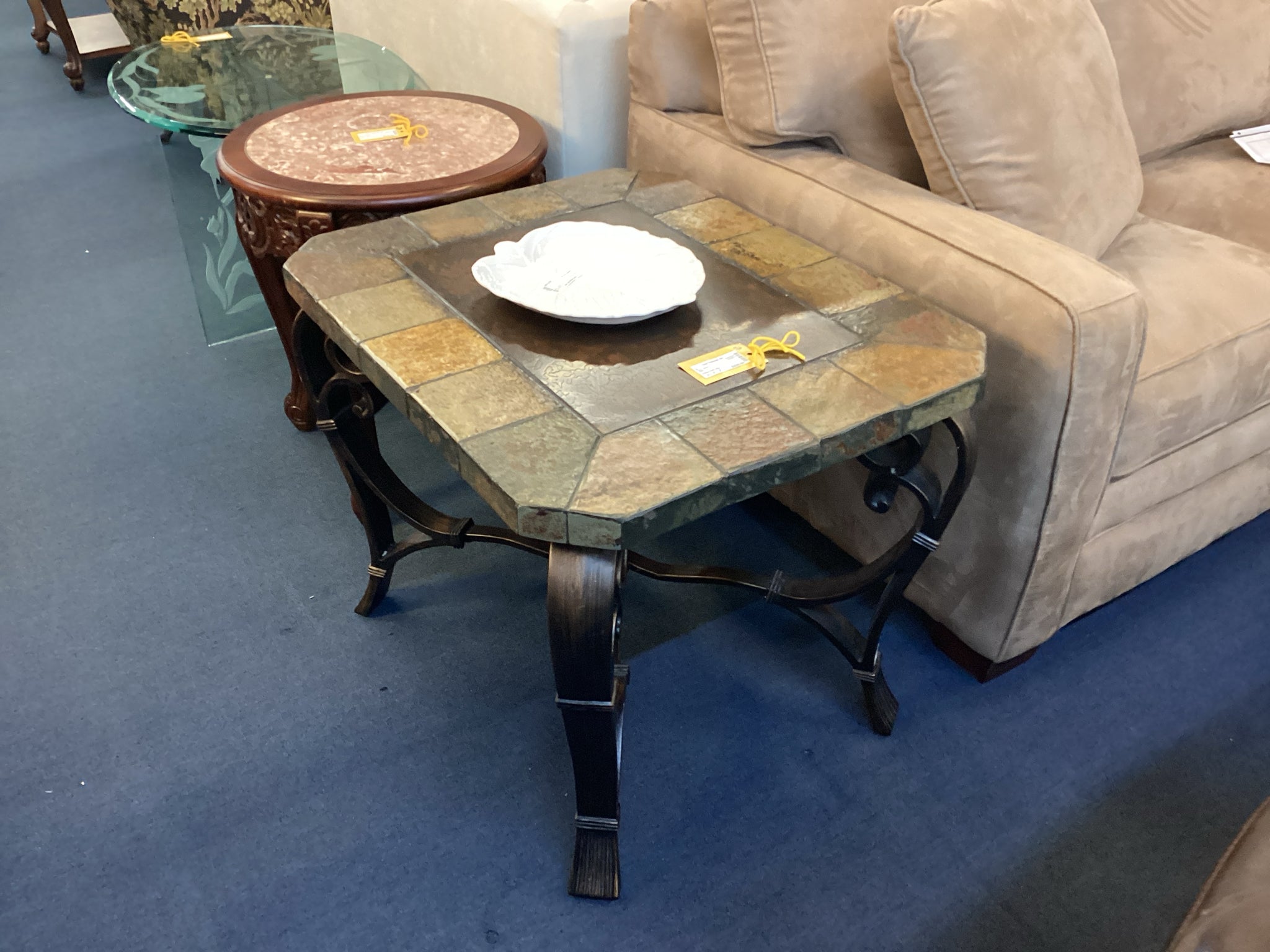 Square Light Wood Coffee Table With Faux Stone Top And Four Stools