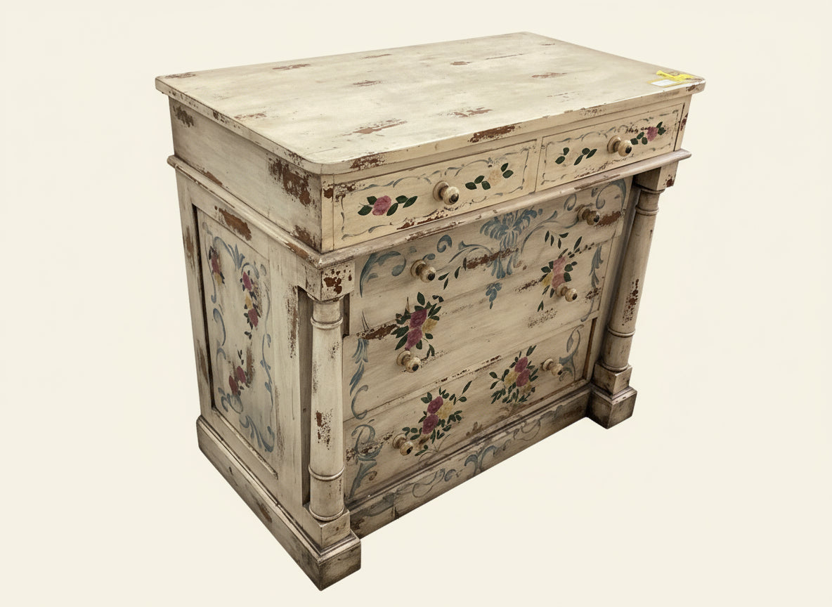 Cream Floral Highboy Dresser With Five Drawers