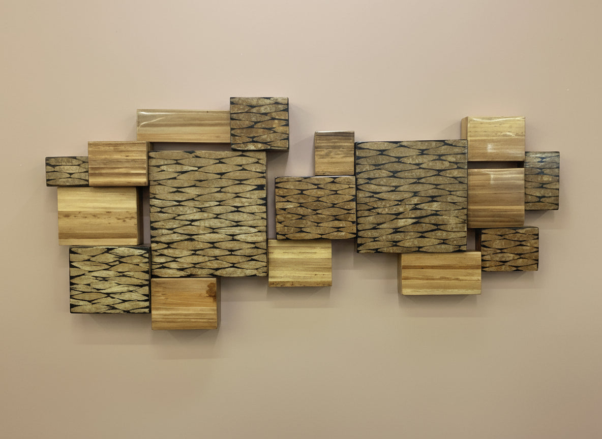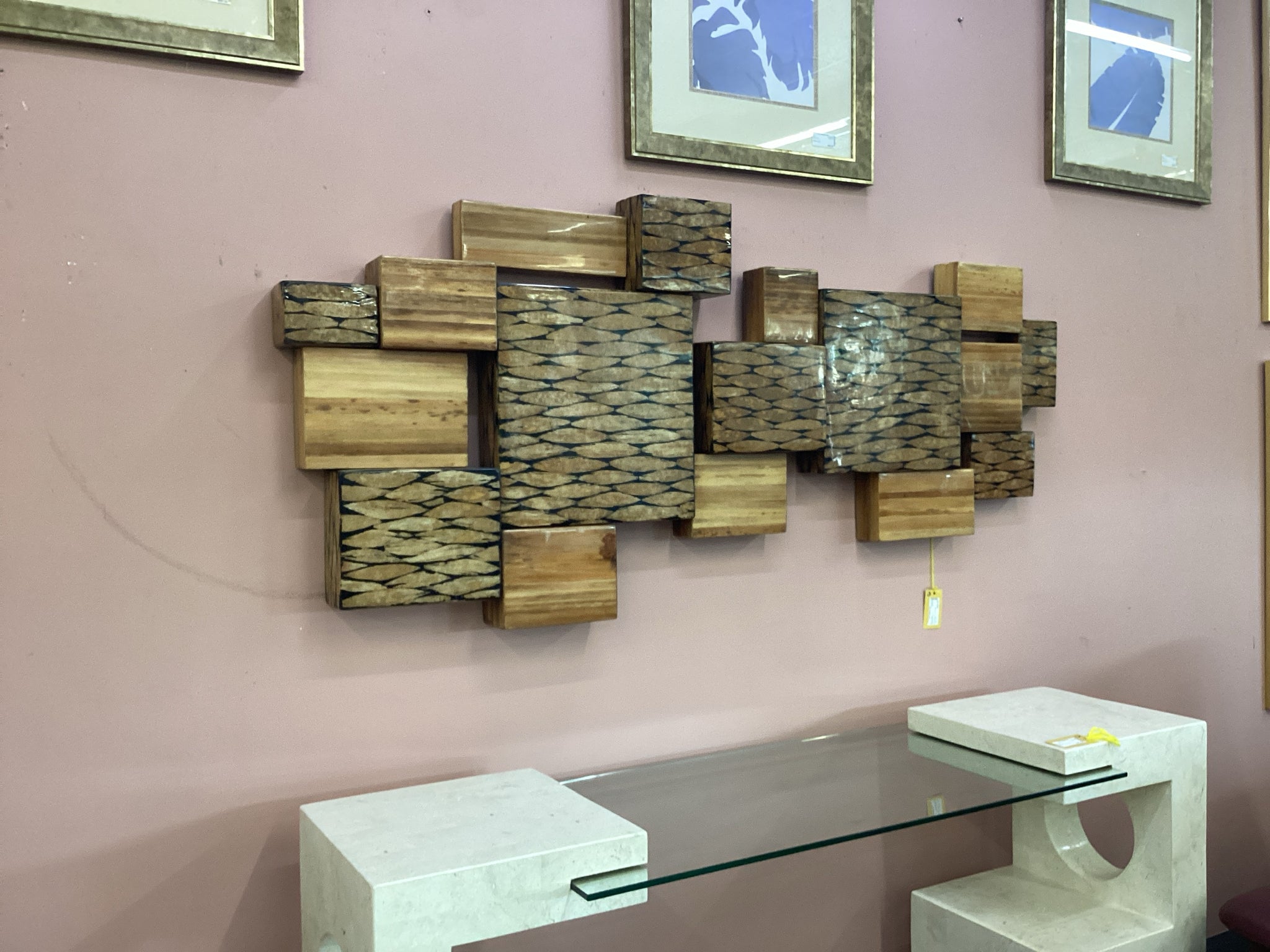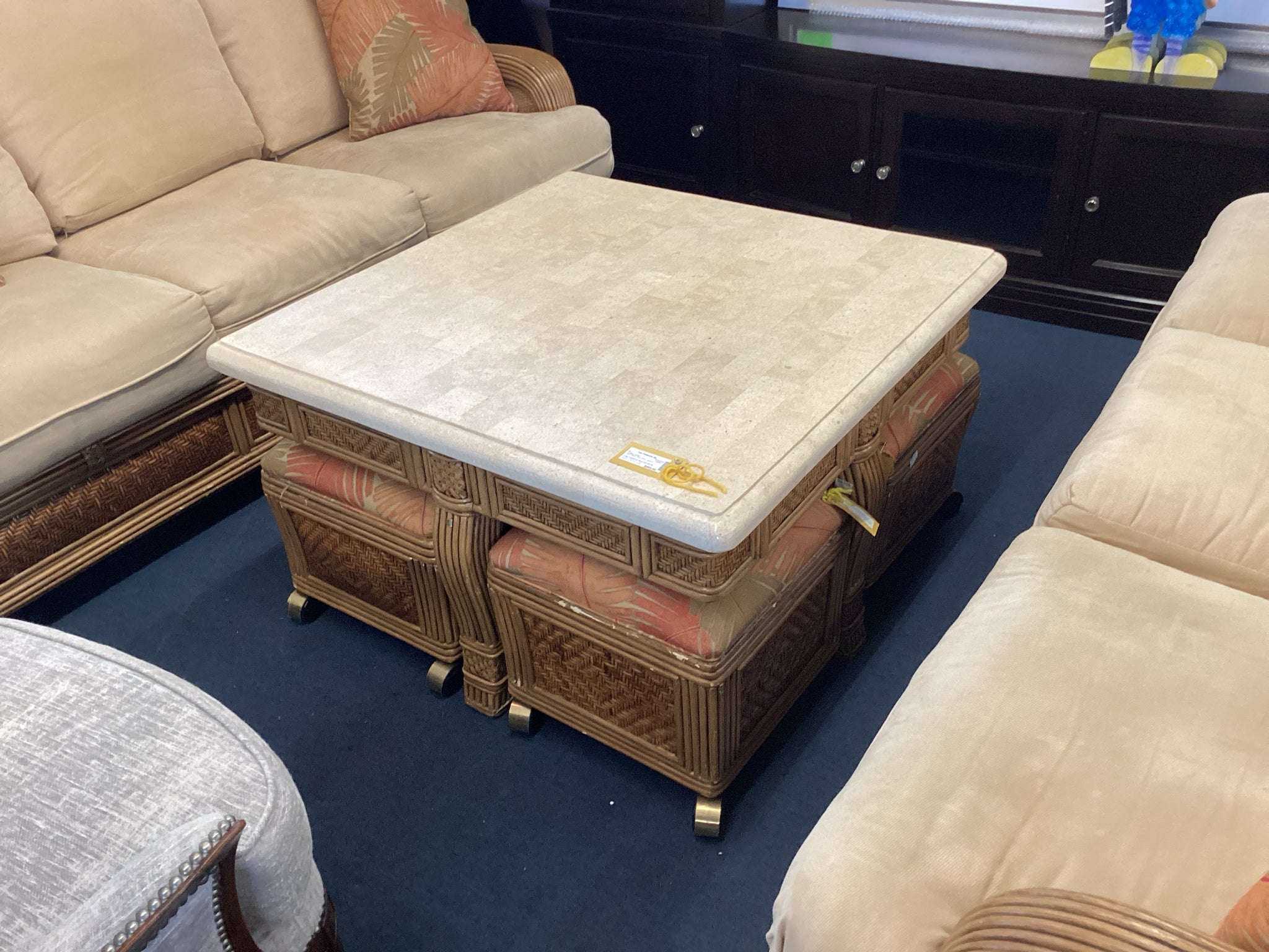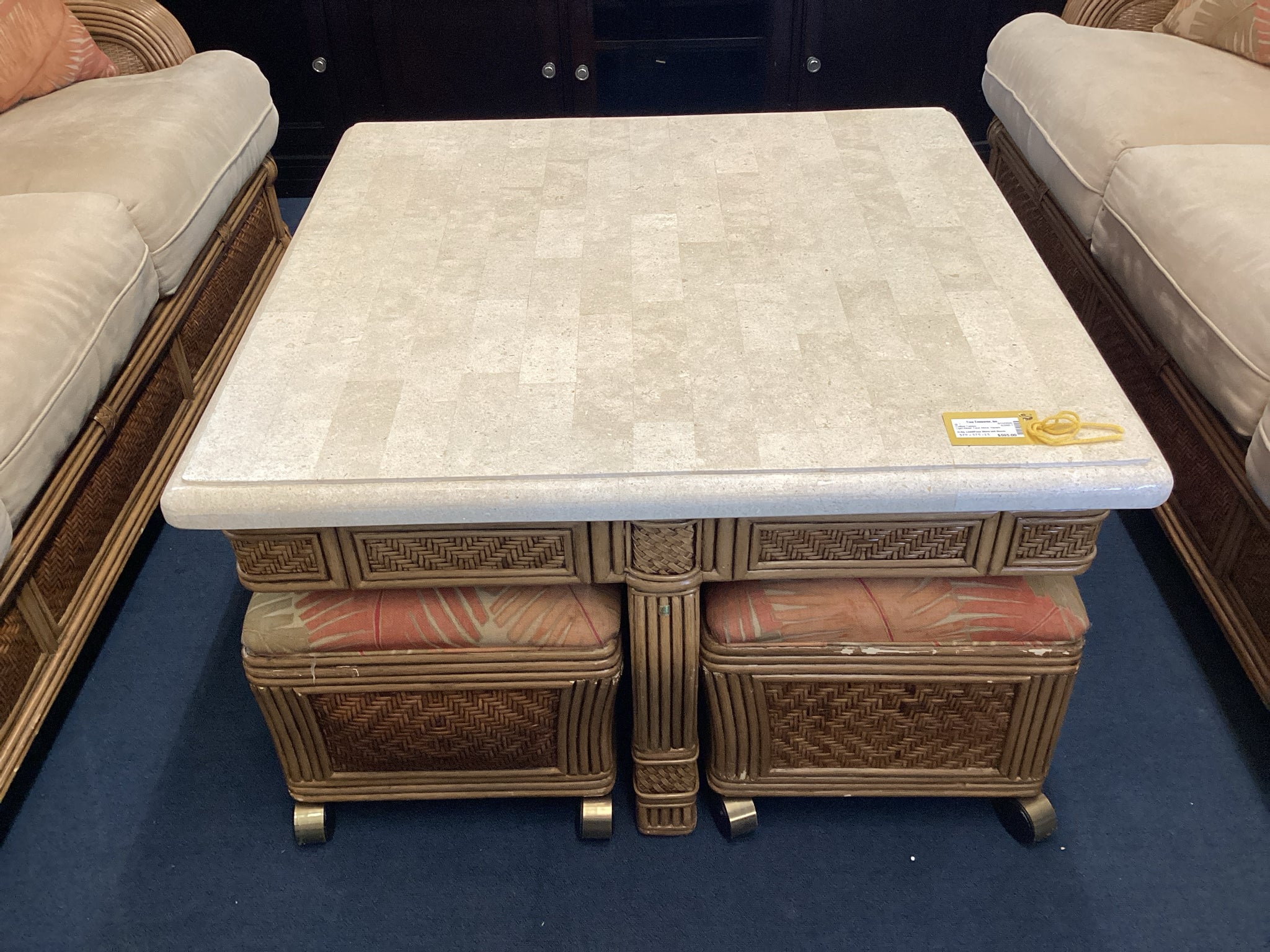 Square Light Wood Coffee Table With Faux Stone Top And Four Stools