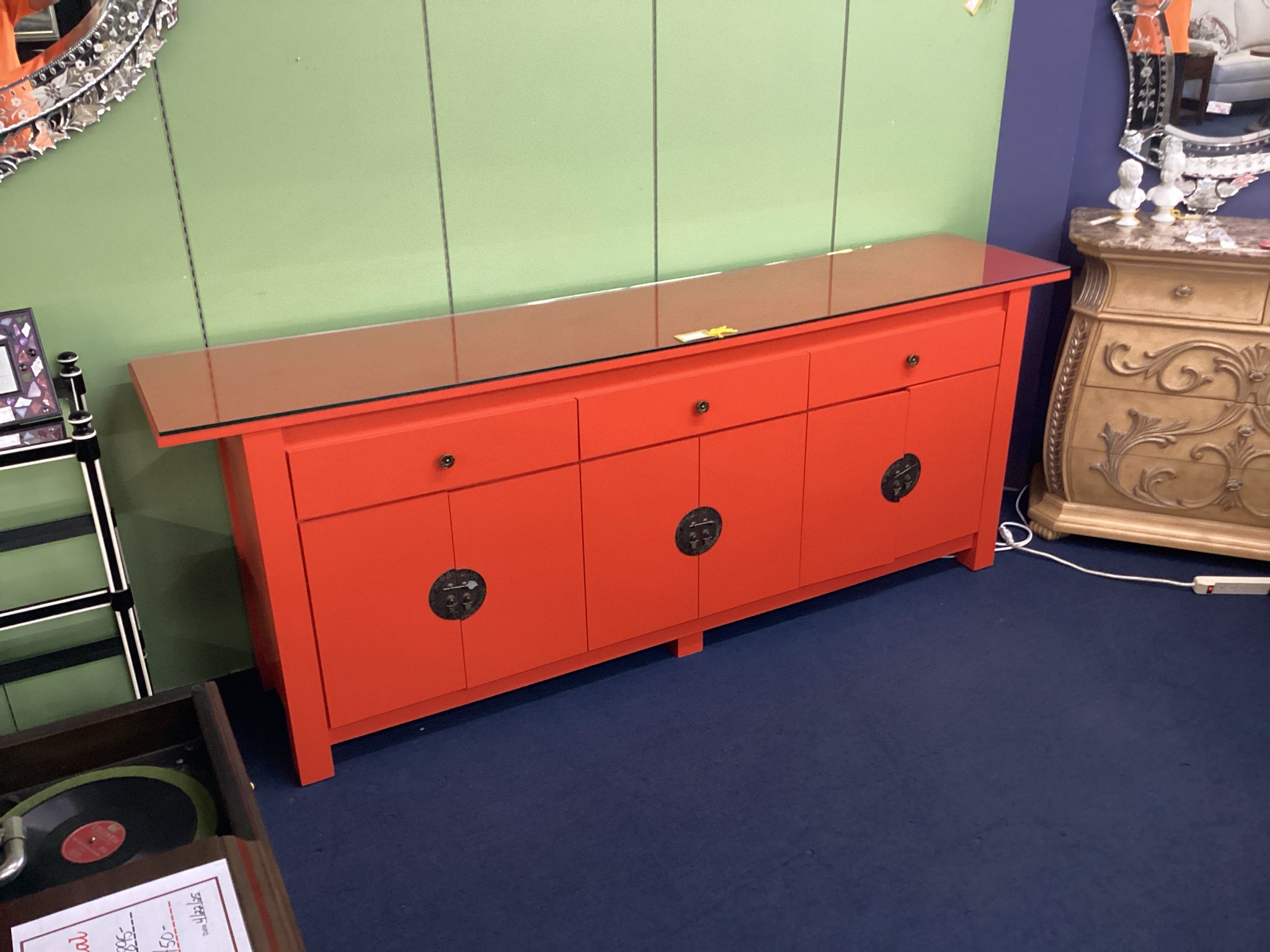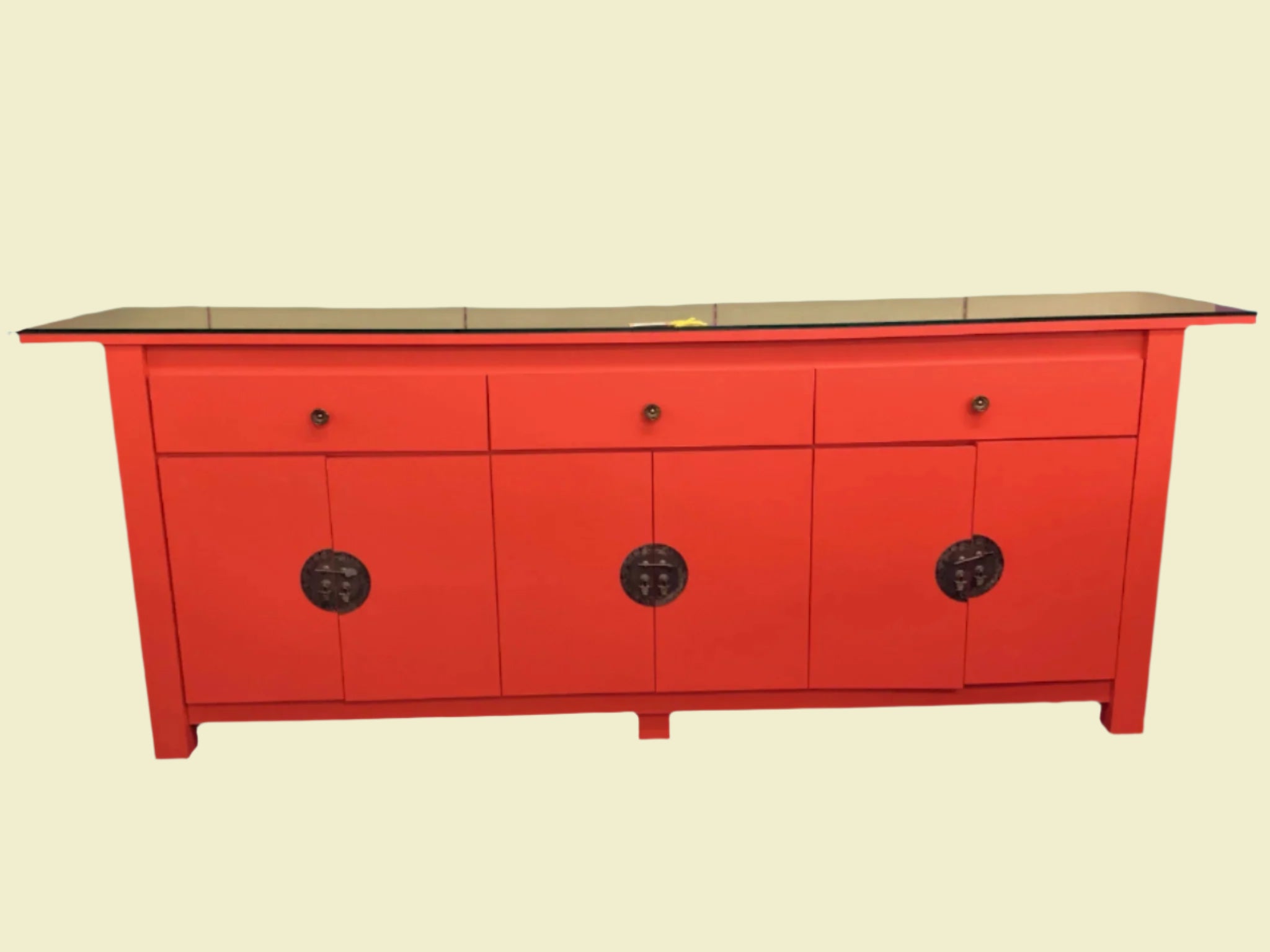 Red Asian Buffet With Glass Top Three Drawers And Three Doors