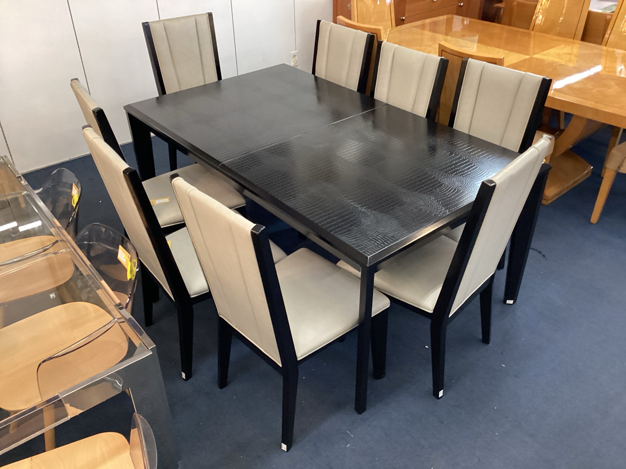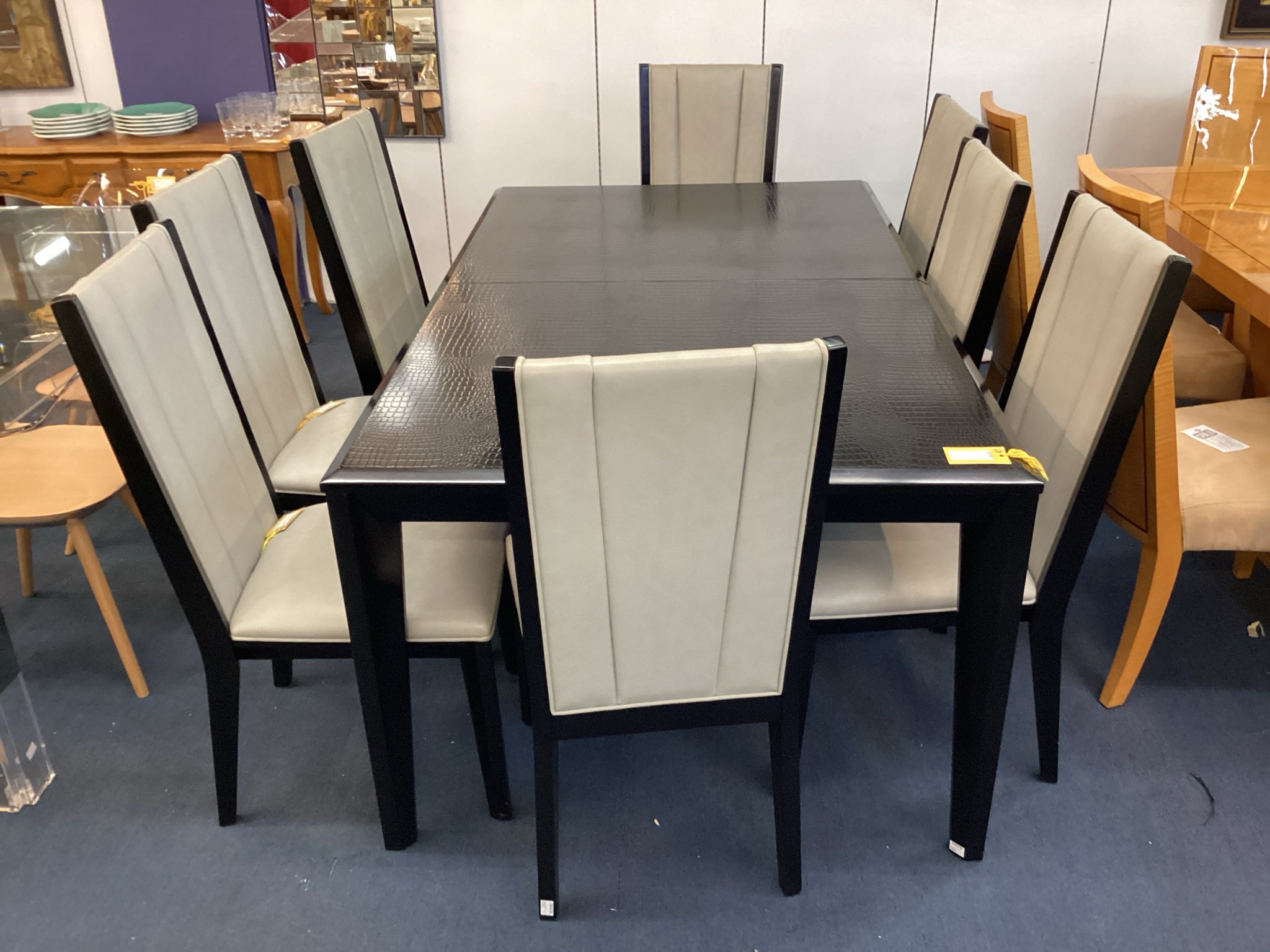 Black Faux Alligator Table With Eight Gray And Black Chairs