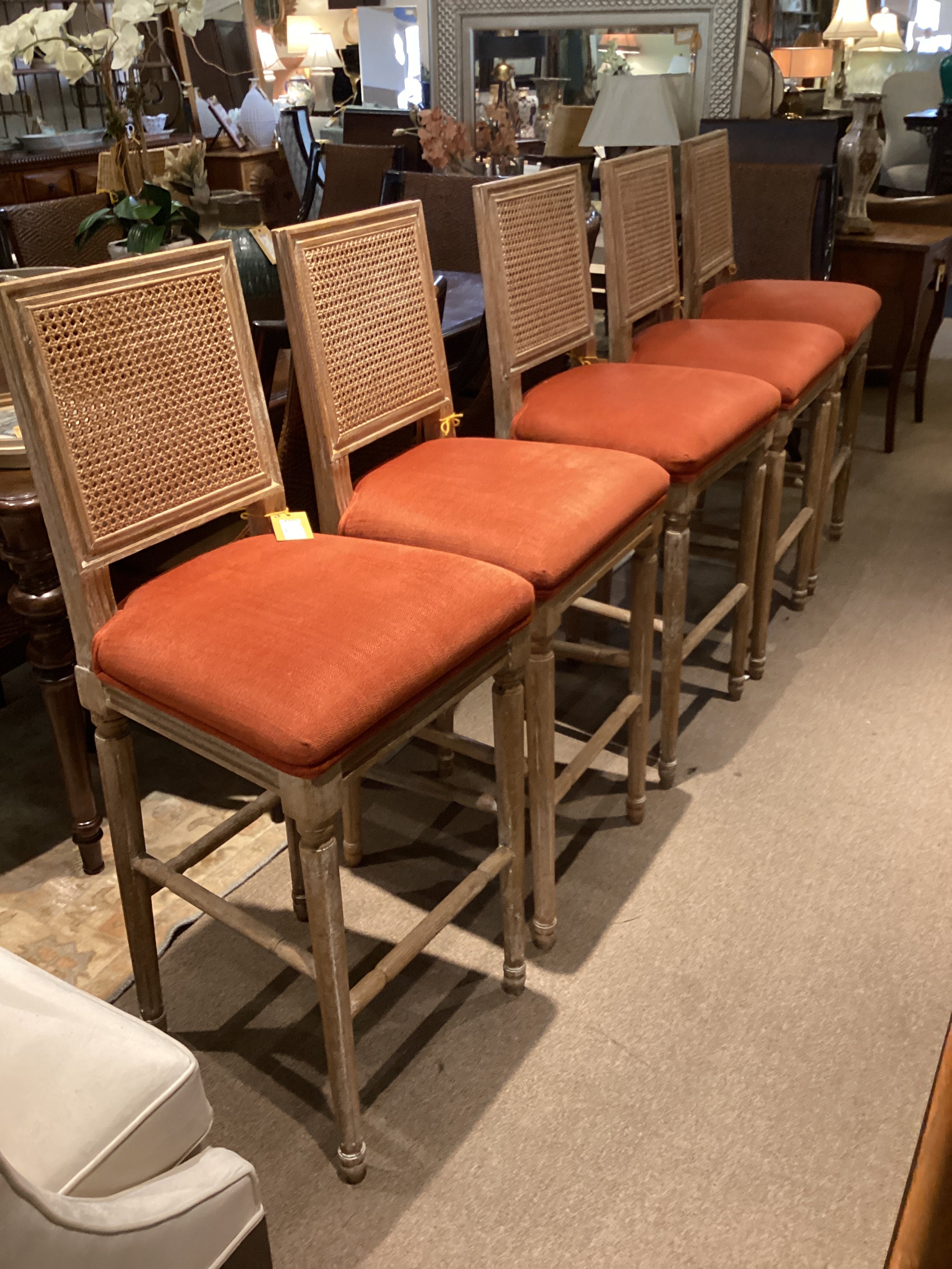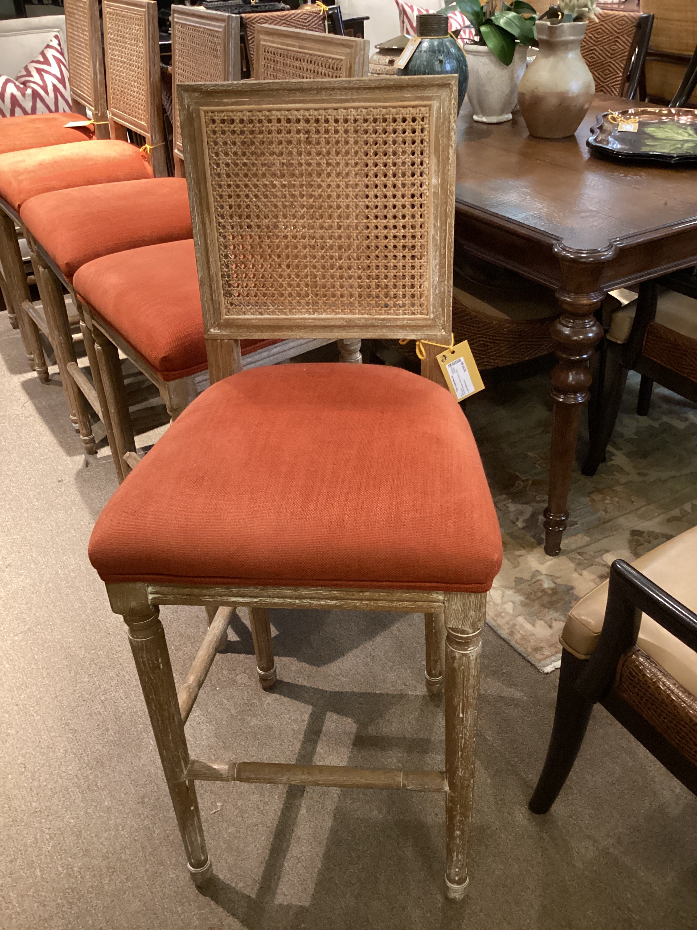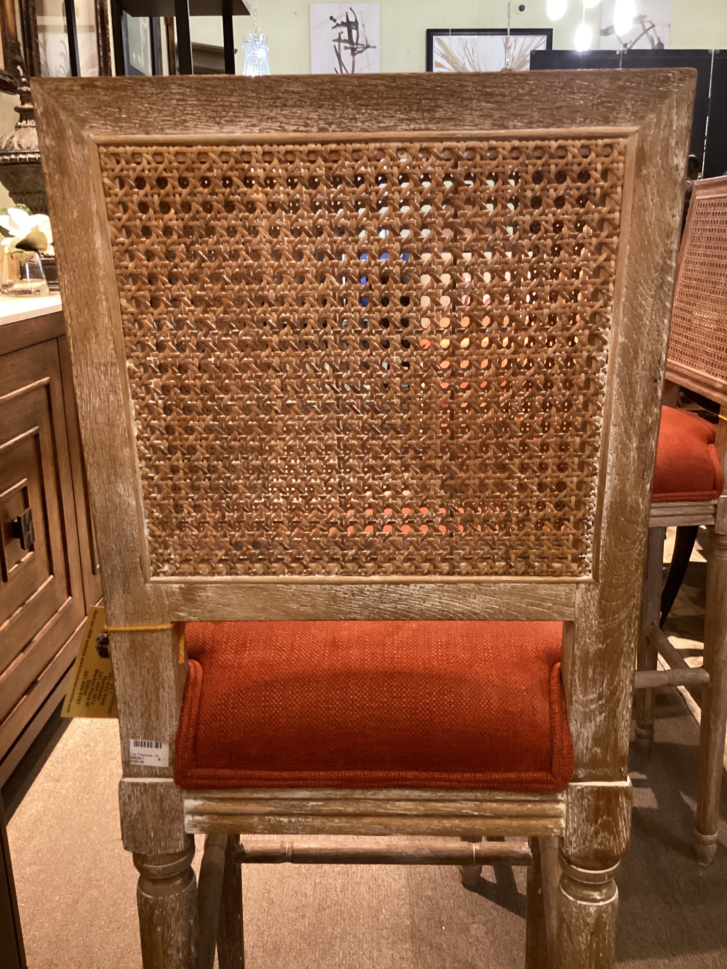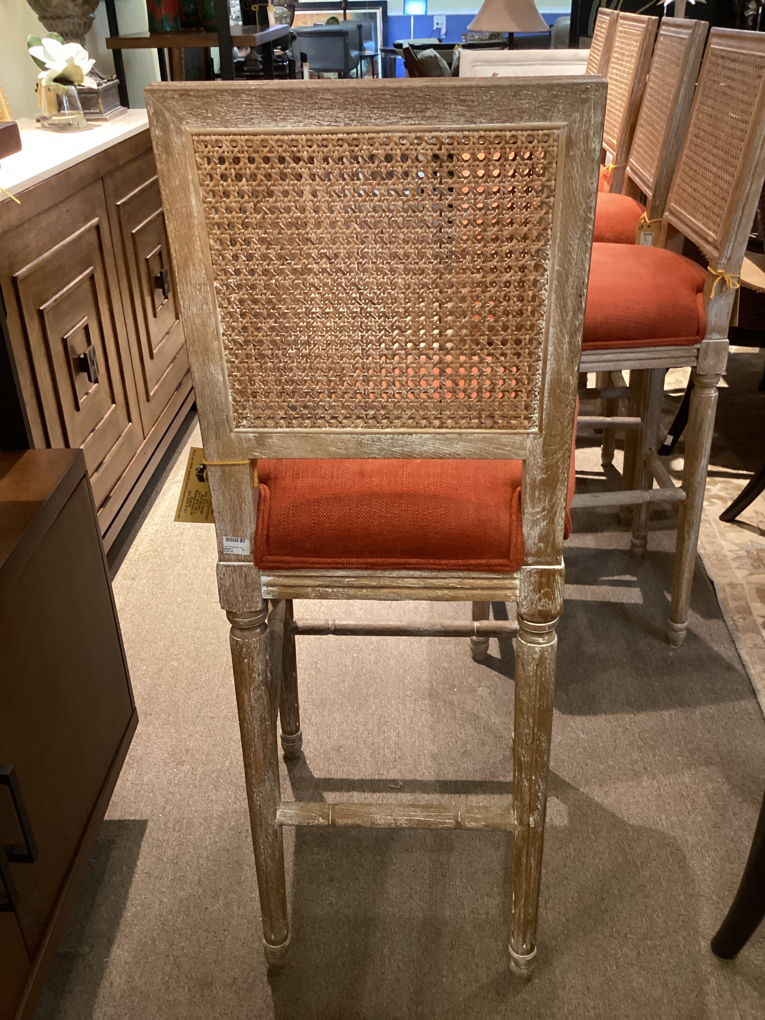 White Washed Cane Back Barstool Orange Seat