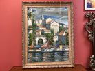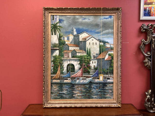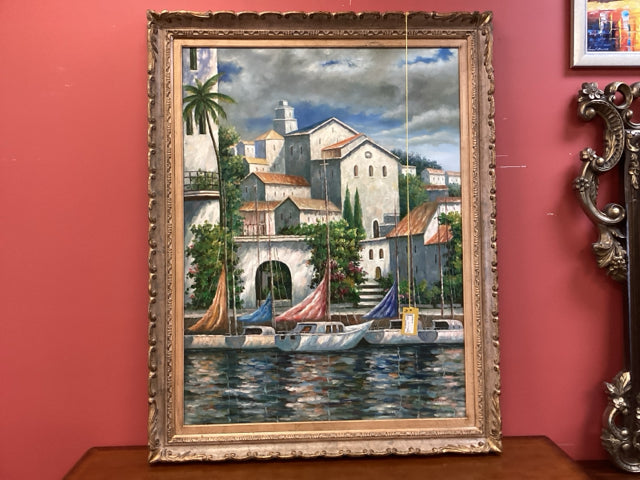 Framed Oil On Canvas Coastal Harbor